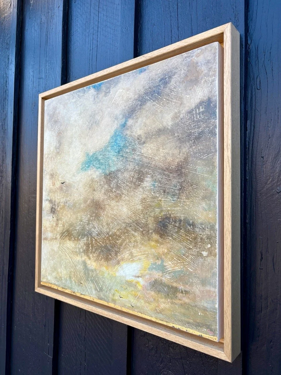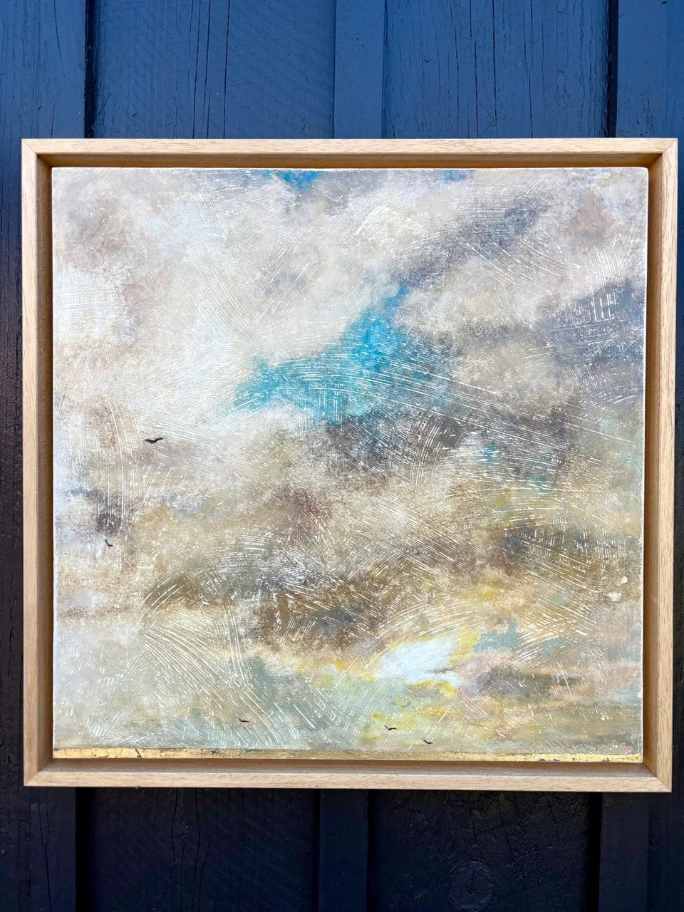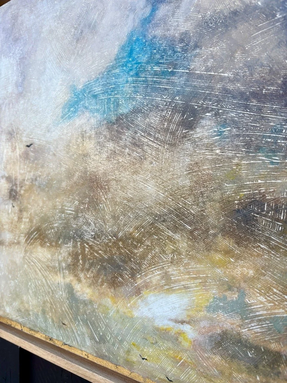 Sur mes tableaux, une fine ligne de couleur ou de feuille d’or vient souvent clore l’œuvre—en haut, en bas, ou sur le côté. Comme une signature discrète, elle est bien plus qu’un détail : c’est une métaphore de la ligne de vie que chacun suit. Cette ligne, c’est l’équilibre entre rigueur et liberté, entre ce que l’on planifie et ce qui nous traverse. Elle rappelle que l’art, comme la vie, se construit entre intention et hasard, entre ce que l’on trace et ce que l’on découvre. Pour moi, elle est aussi un hommage à ces moments où l’œuvre semble achevée… mais où il reste encore une touche à ajouter. Une façon de dire : « Ici, quelque chose a été vécu, et maintenant, c’est à vous de le prolonger. »
